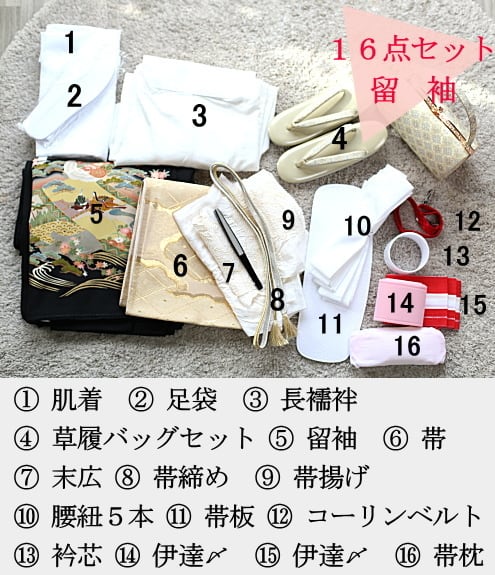 色留袖/帯/長襦袢/帯揚げ/帯締め/伊達締め2本/衿芯/帯板1枚/帯枕/腰紐5本/コーリン/草履/バッグ/肌着/足袋/末広